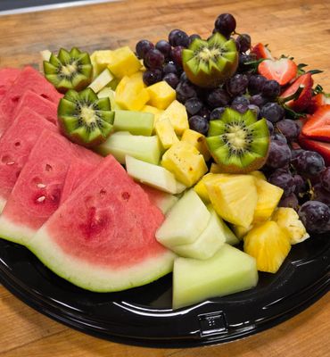 Includes: Meat & Cheese Tray (Ham, Turkey, Roast Beef, Assorted Cheeses), Half Size or Butter Buns, Vegetable Tray with Dip, Cheese Torte with Crackers, Fruit Bowl, Pasta or Potato Salad & Condiments.